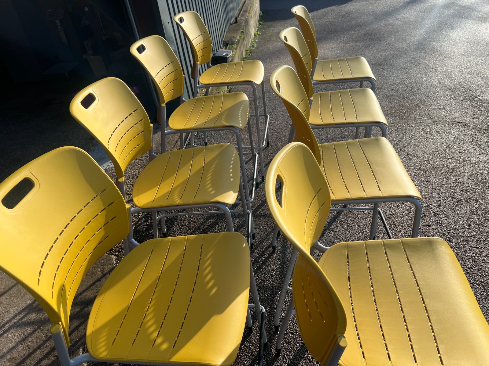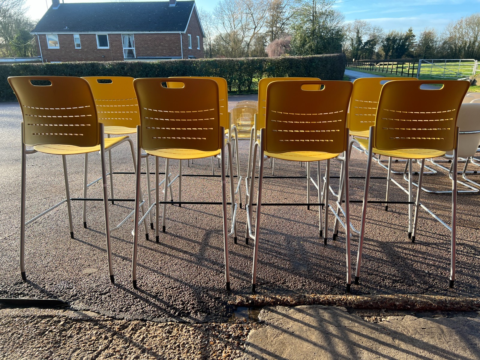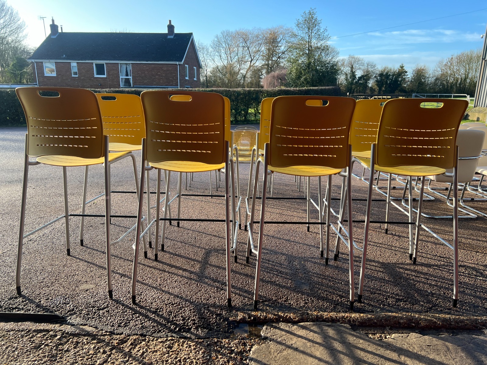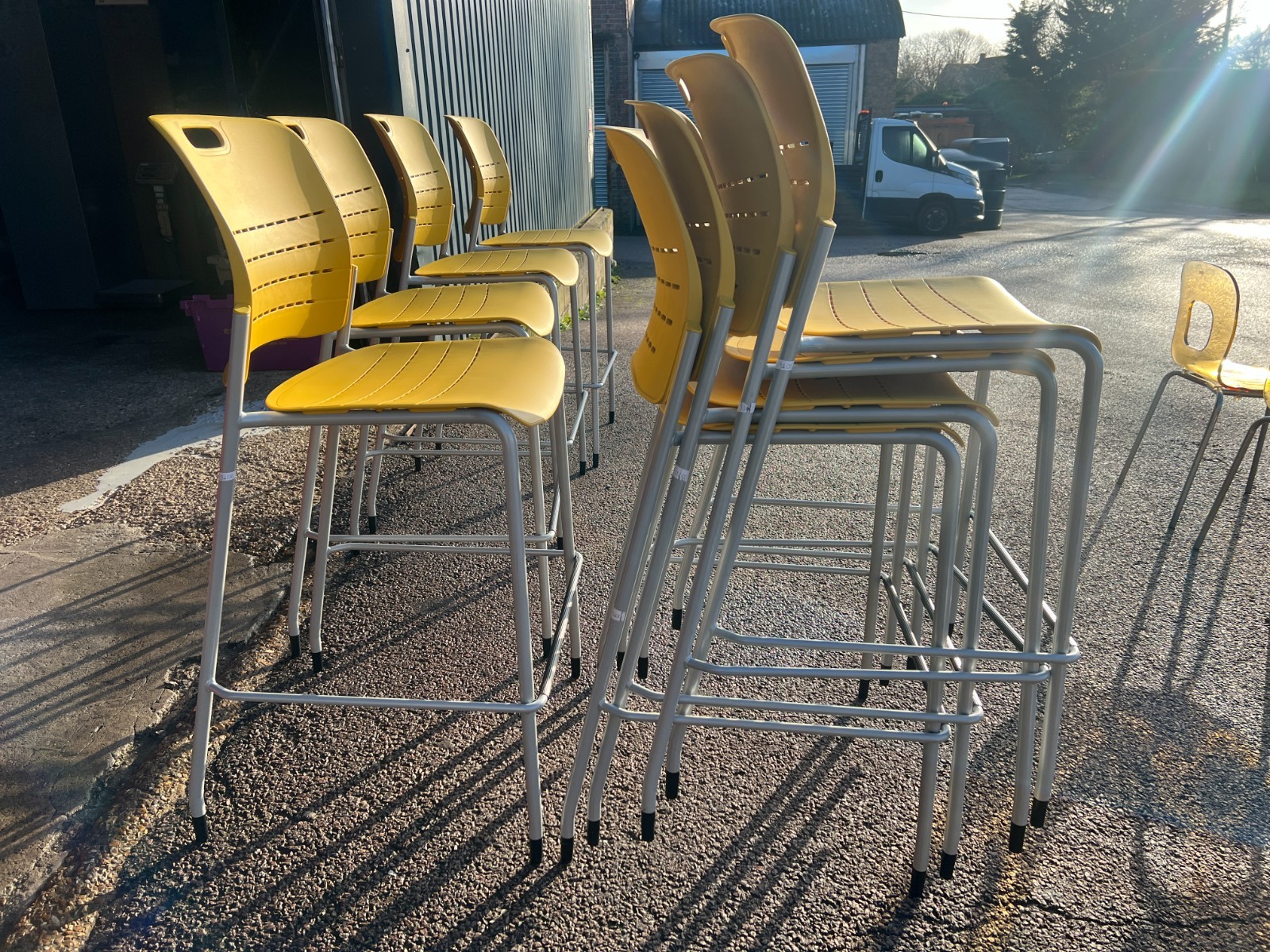 Set of 8 Senator bar stools with a bright citrus yellow seat/back and a sturdy silver frame.