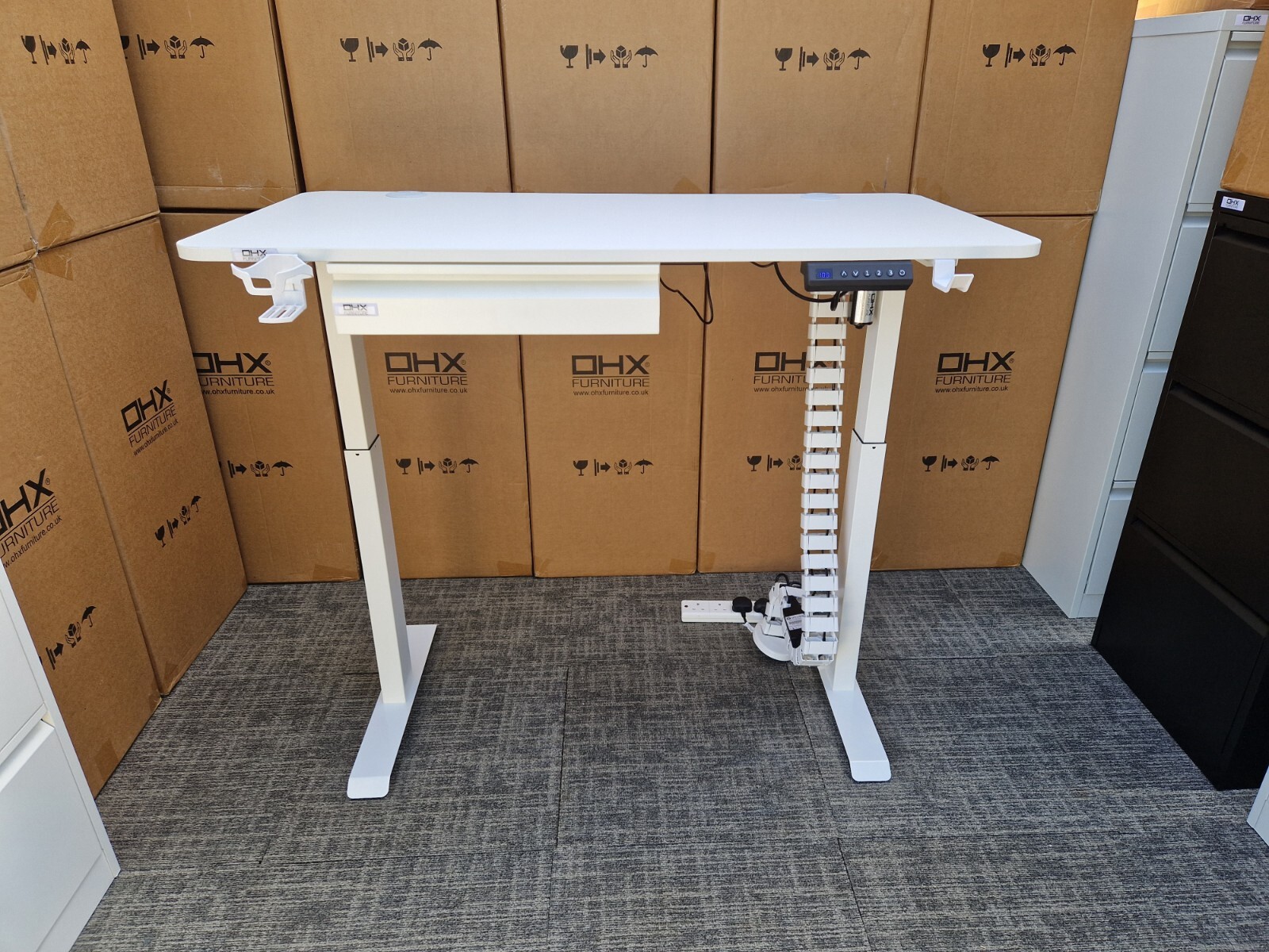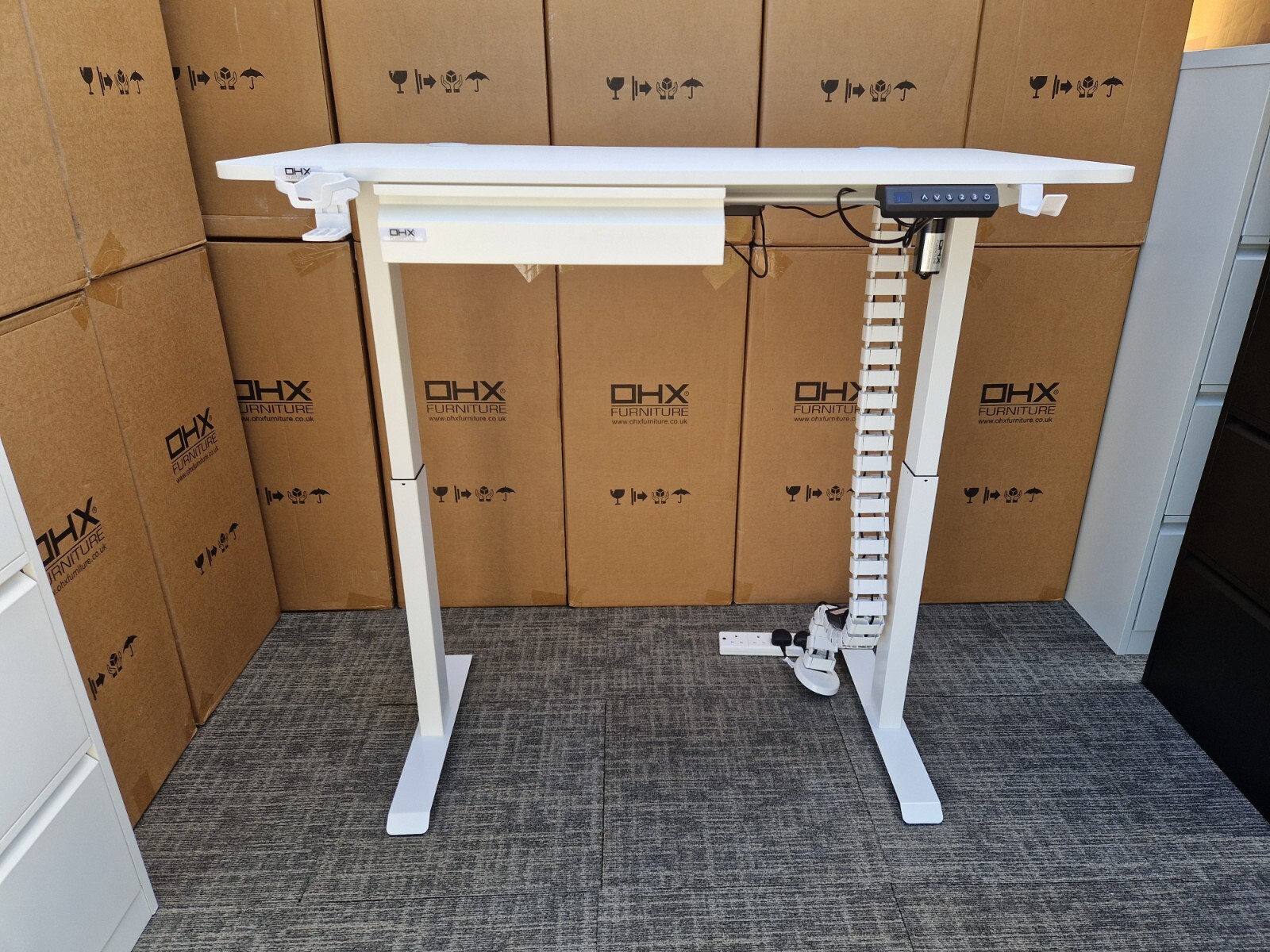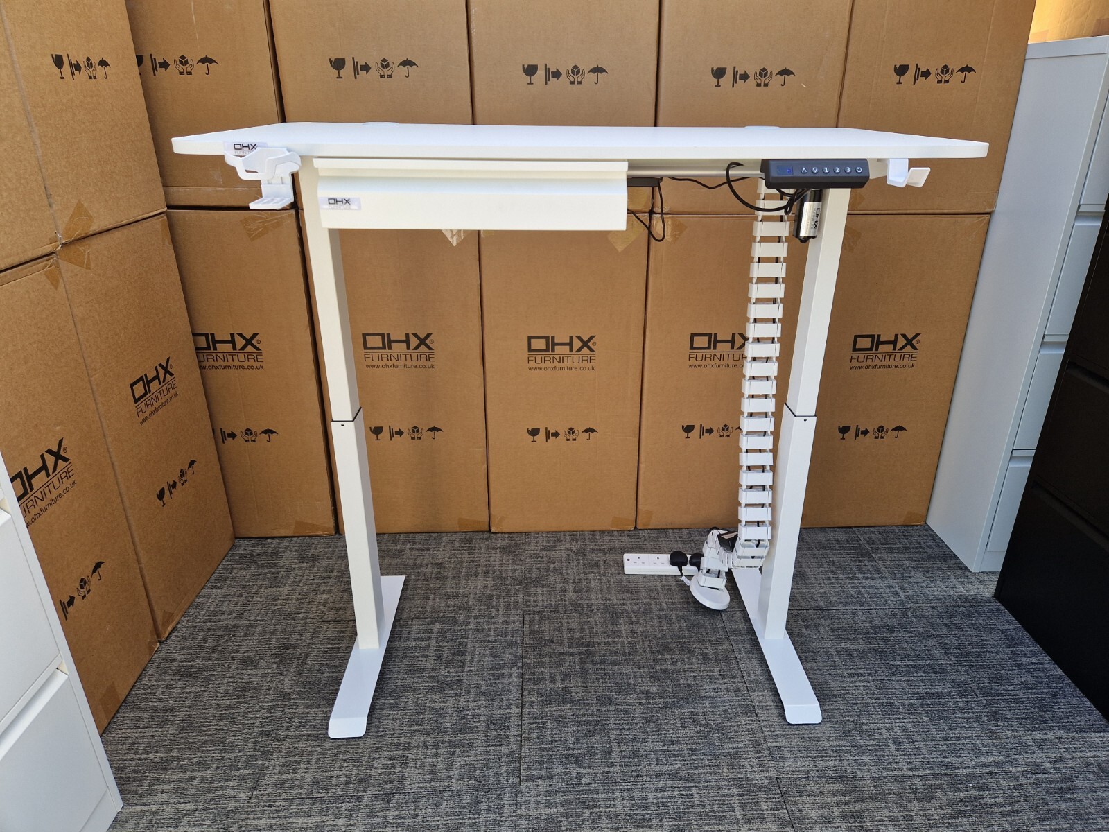 Electric Standing Desks from OHX Furniture. Complete with a three-pin UK power cable, fixtures and fittings, this ergonomically-designed desk has everything you need to work smarter.