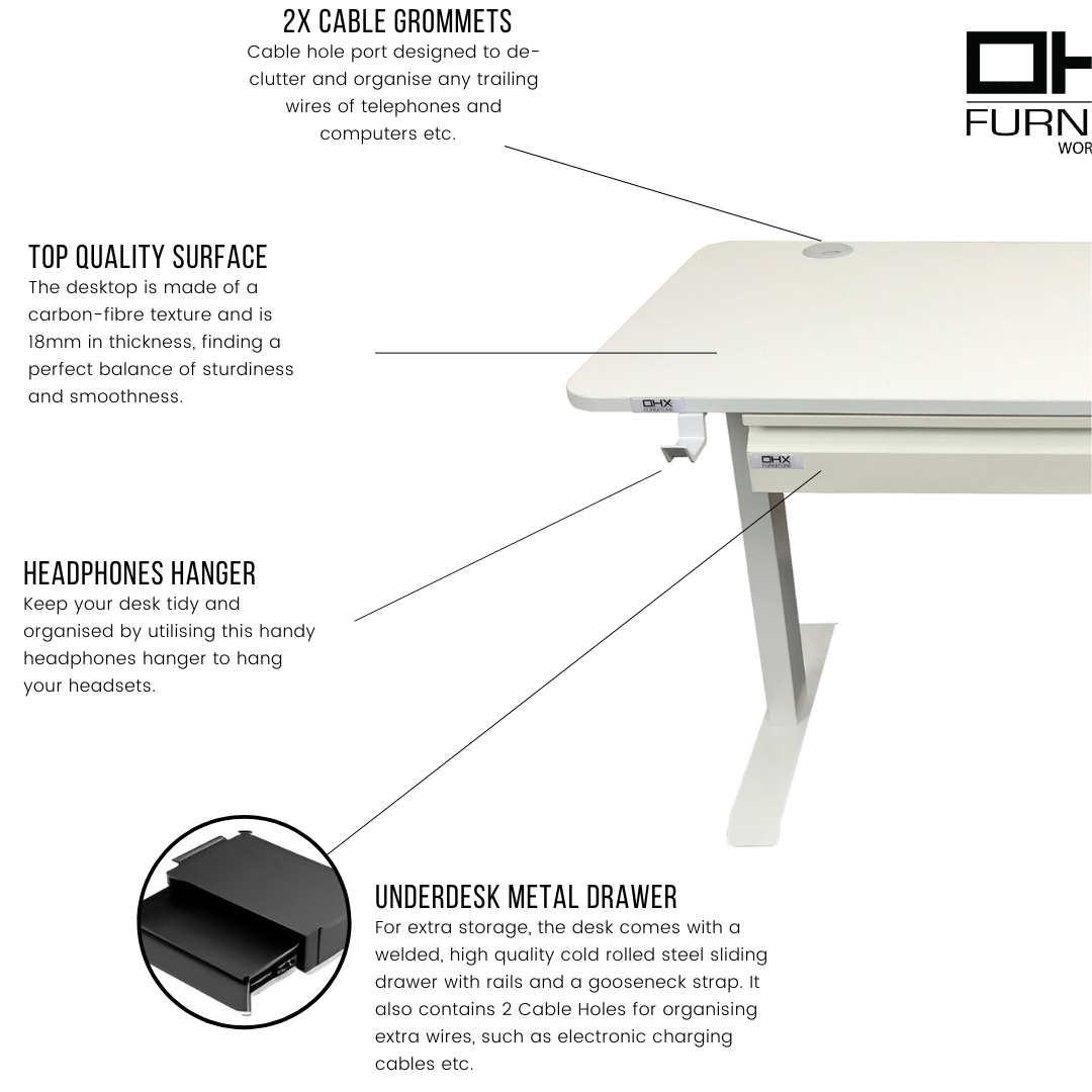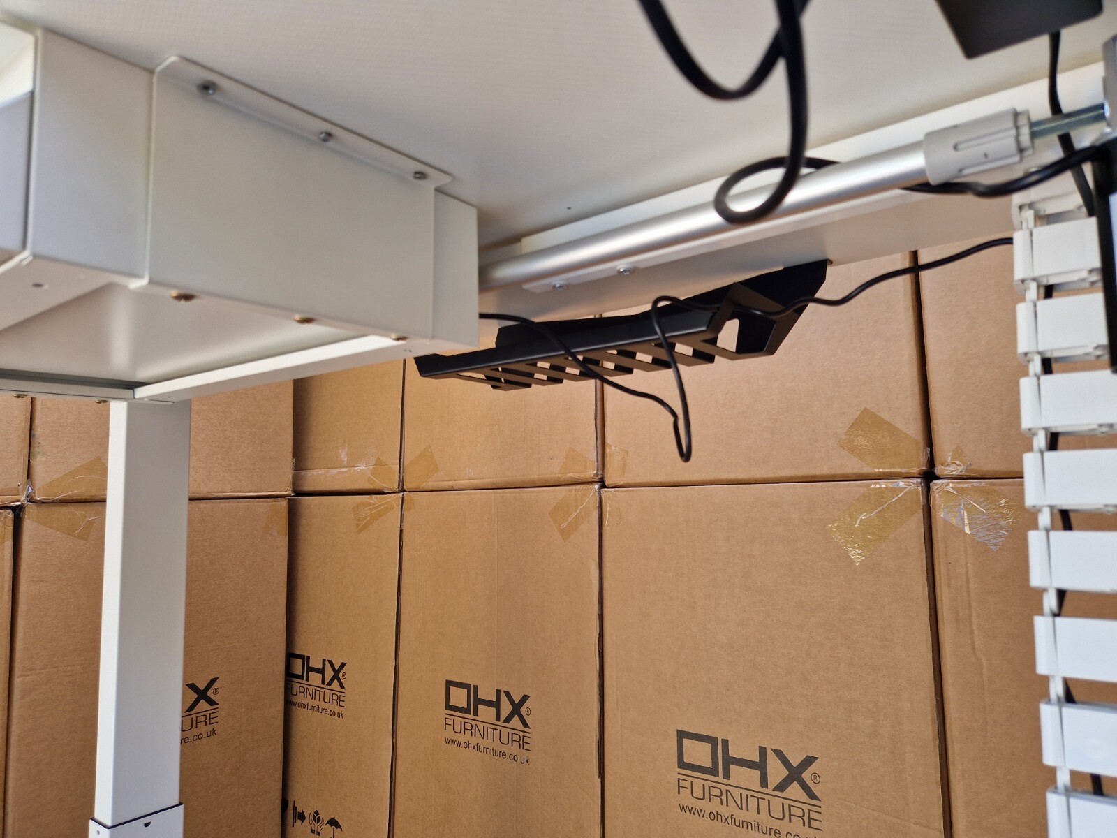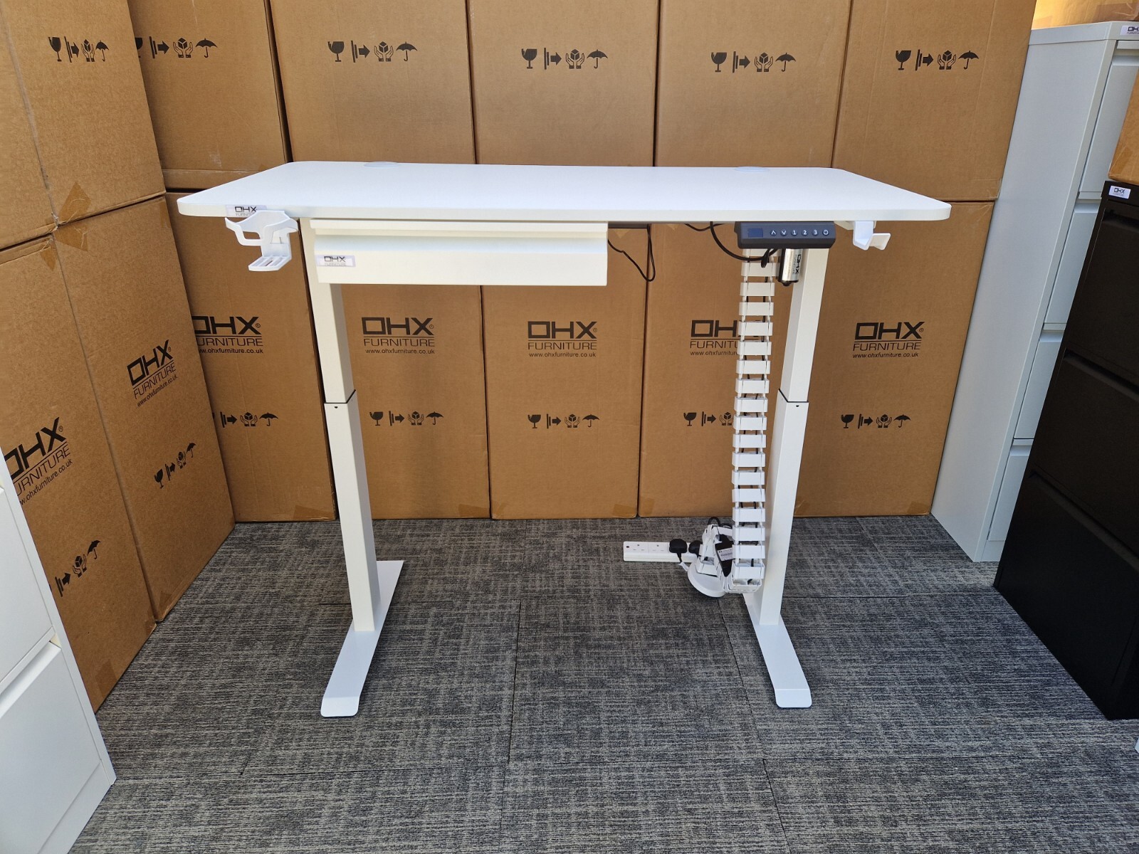 Electric Standing Desks from OHX Furniture. Complete with a three-pin UK power cable, fixtures and fittings, this ergonomically-designed desk has everything you need to work smarter.