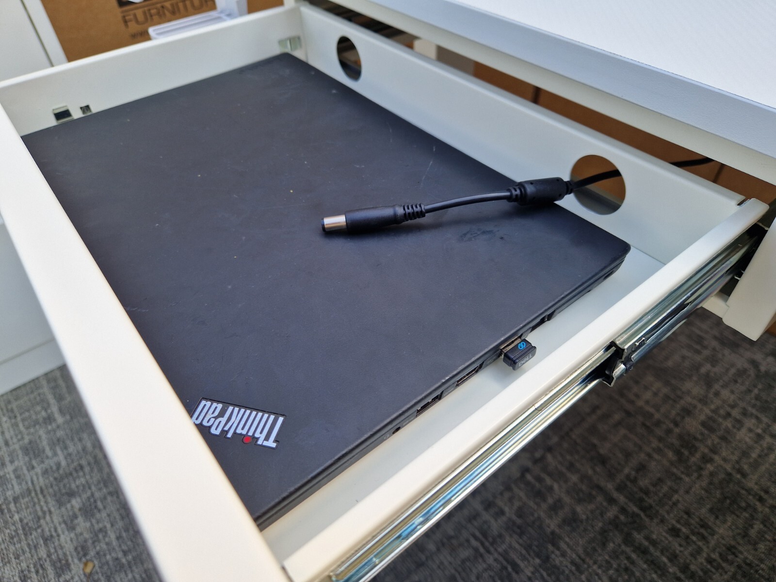 Two small cable holes at the back of the drawer enable the charging cables to run under the desk with minimal mess.