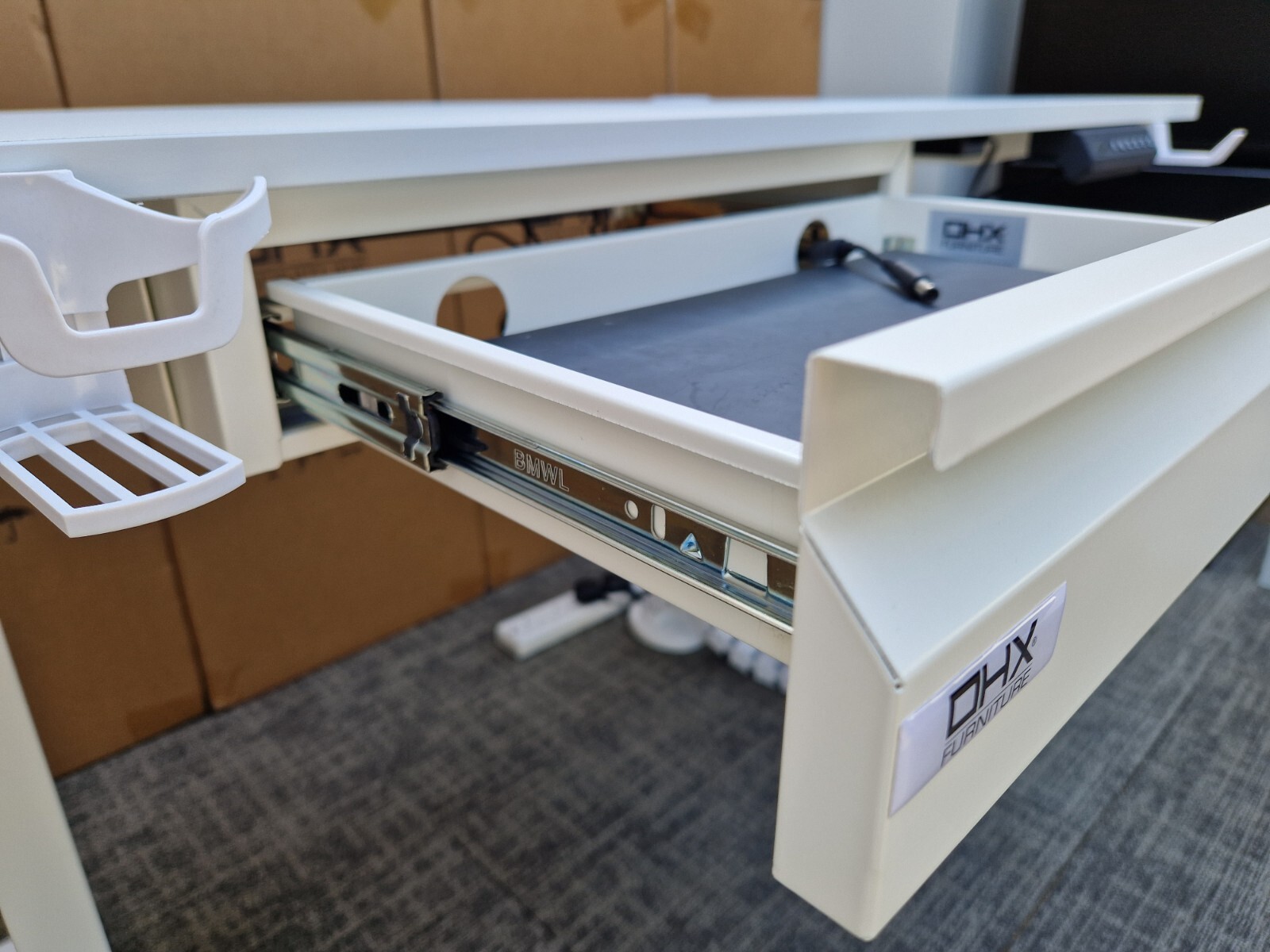 Other desks on the market also lacked storage. The OHX Furniture sit/stand desk has a sliding drawer with a gooseneck handle and three-stage sliding drawer runners. It is large enough to store a small laptop or tablet.