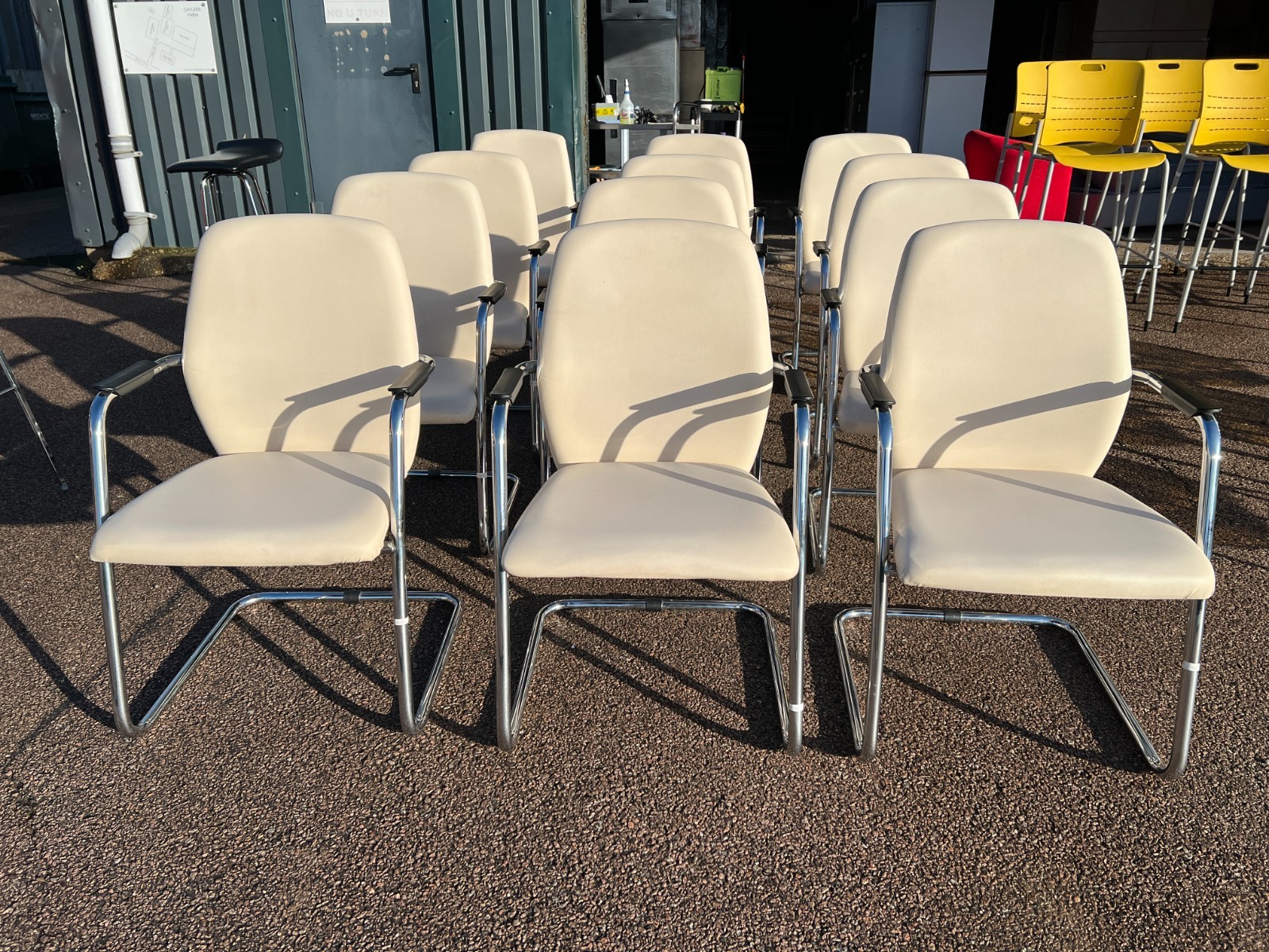 Set of 12 SitLand cantilever meeting / visitor chairs with a smart cream upholstered finish, chrome sled (cantilever) base, and armrests with black arm pads. A clean, modern look that works well in meeting rooms, waiting areas, reception spaces, training rooms, or boardrooms.