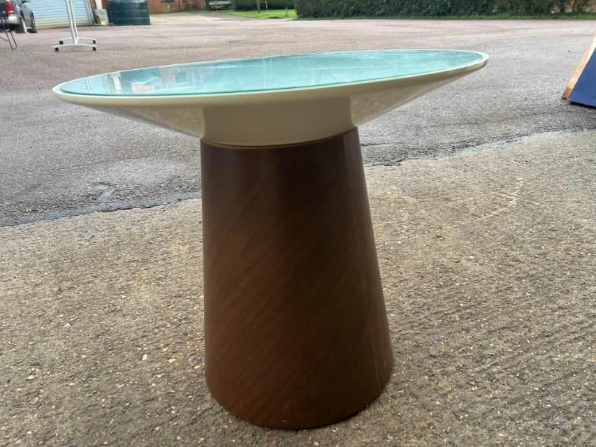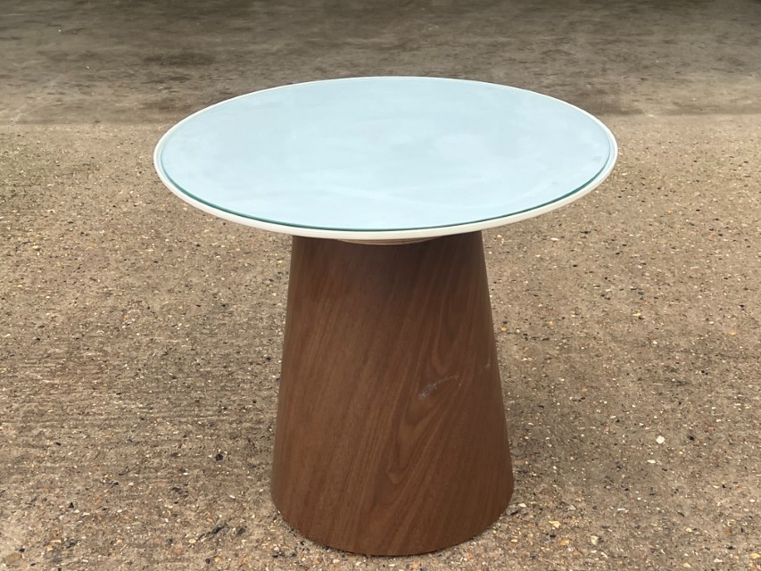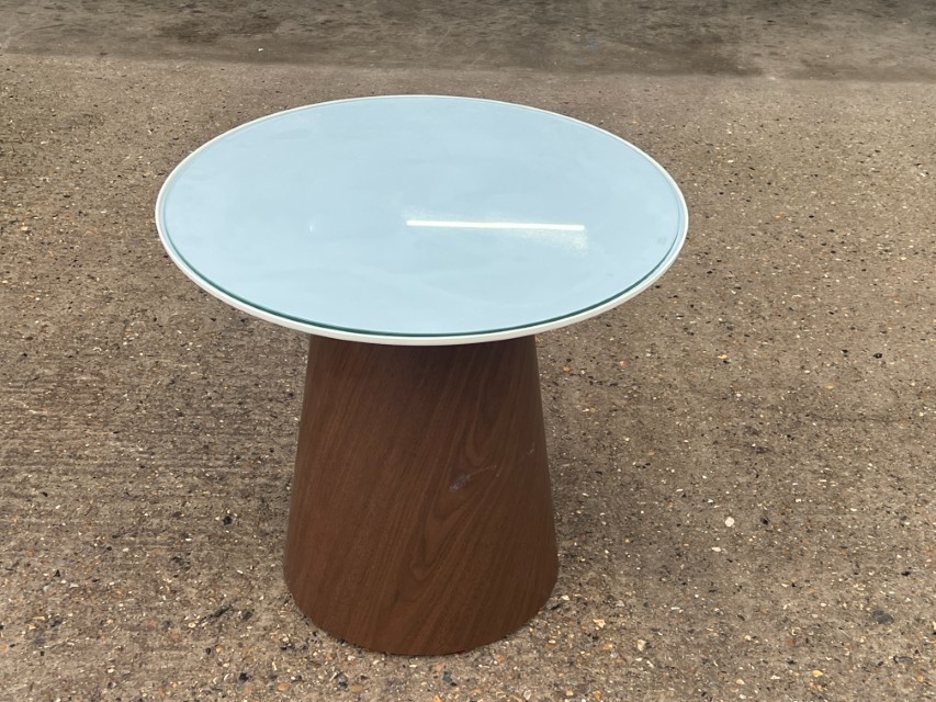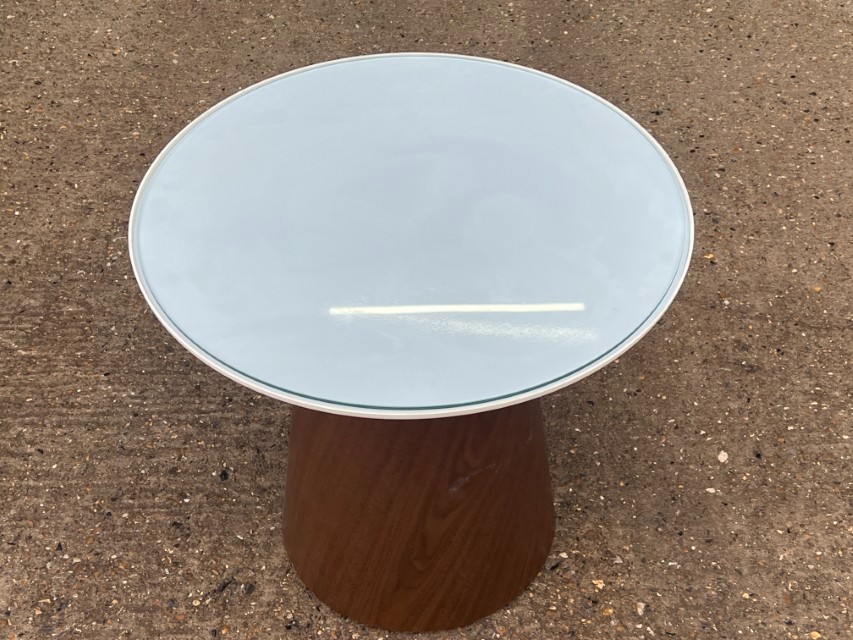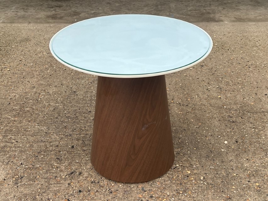 Modern round side/occasional table featuring a sleek glass top and a stylish cone-shaped base in a walnut tone finish. A great fit for lounges, reception areas, breakout spaces, waiting rooms, or home interiors.