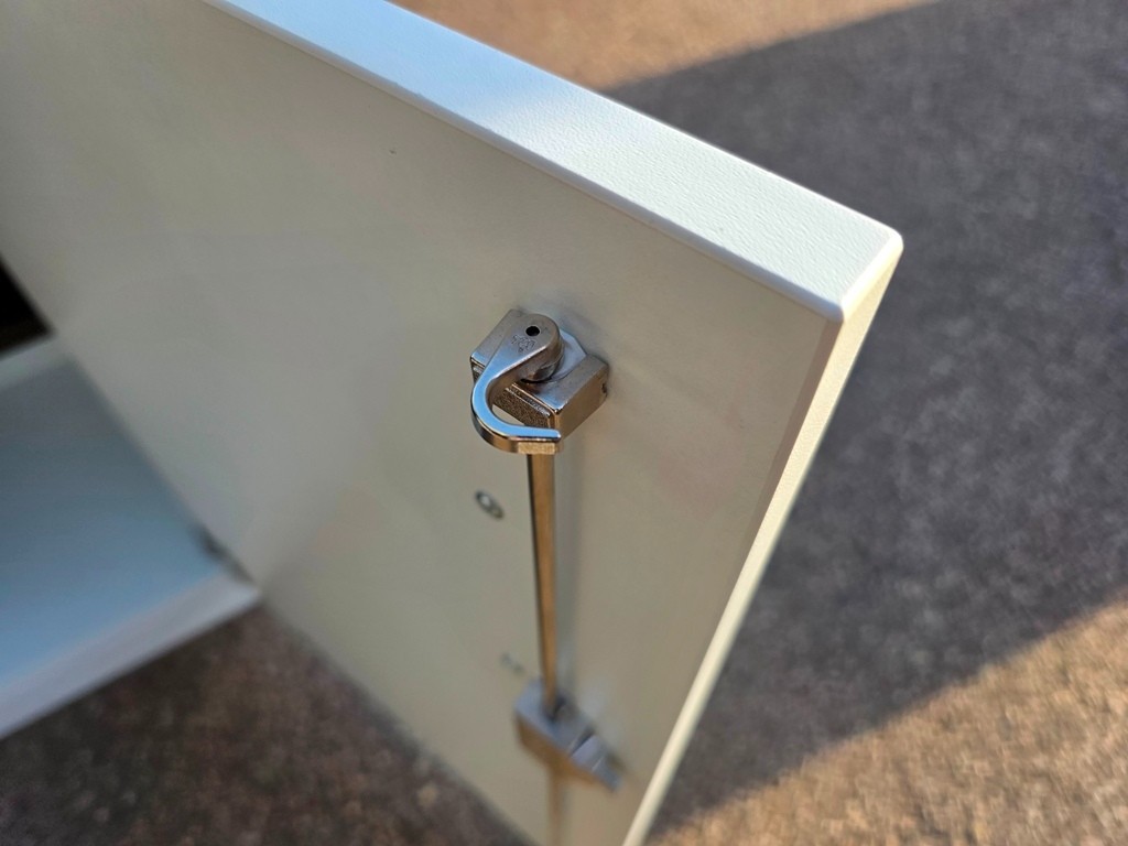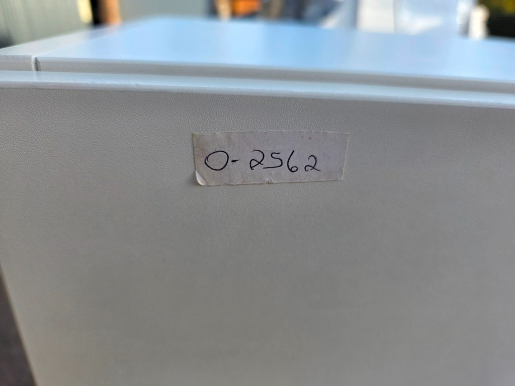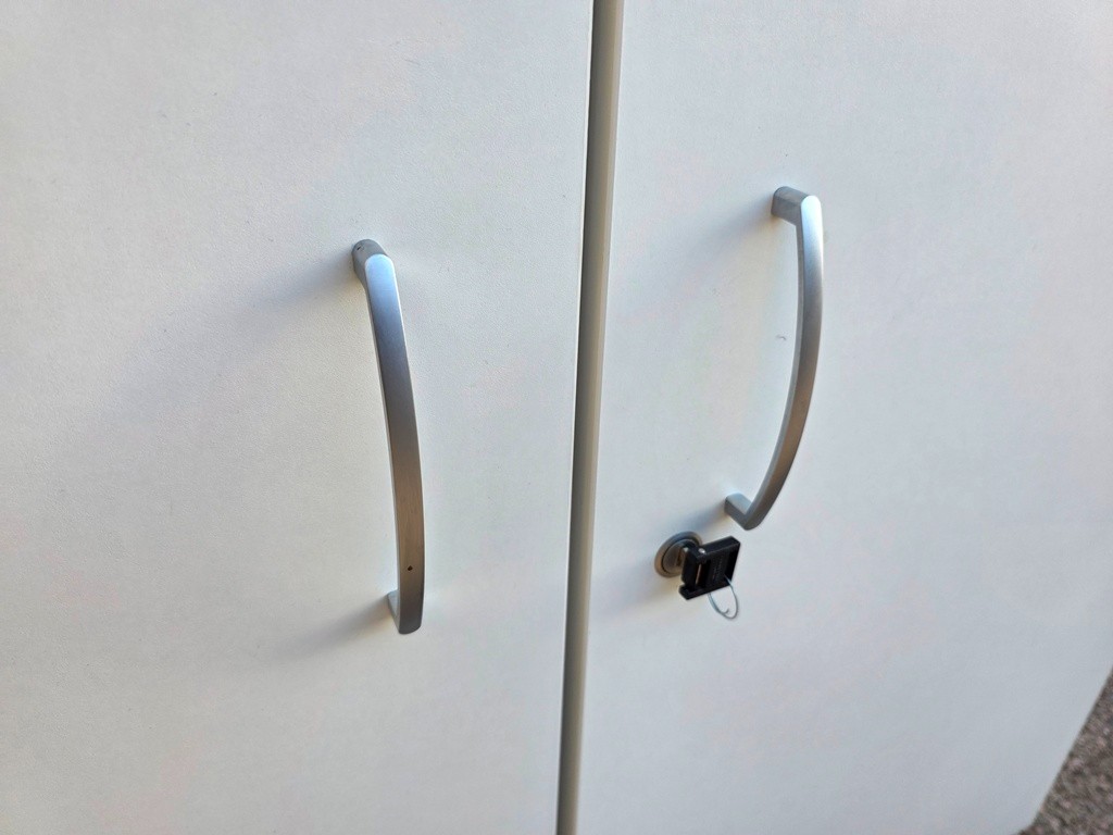 Neat, modern white cupboard with double doors and a lock/key—ideal for office storage, paperwork, supplies, or general home storage.