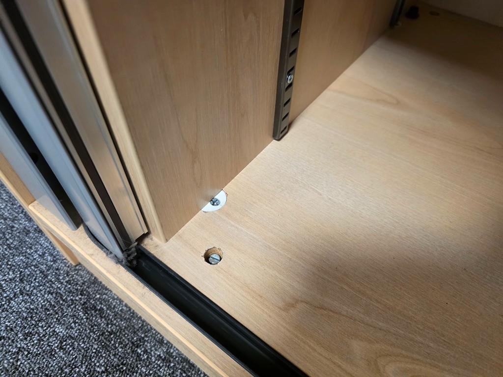 Professional low sliding-door storage cupboard in a maple finish. Desk-height (approx. 730 mm) credenza ideal for organised storage in offices, schools and reception areas. Great condition and can be dismantled for easier transport and access.