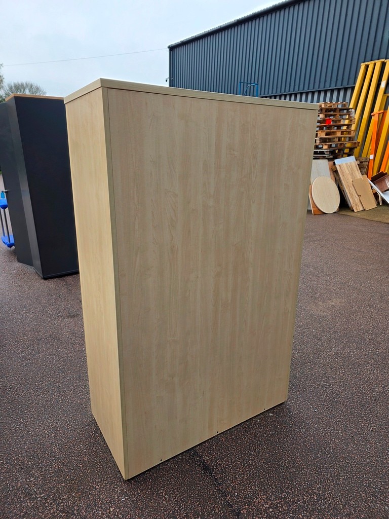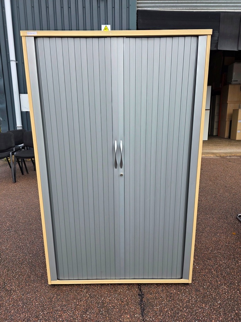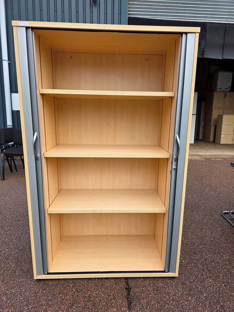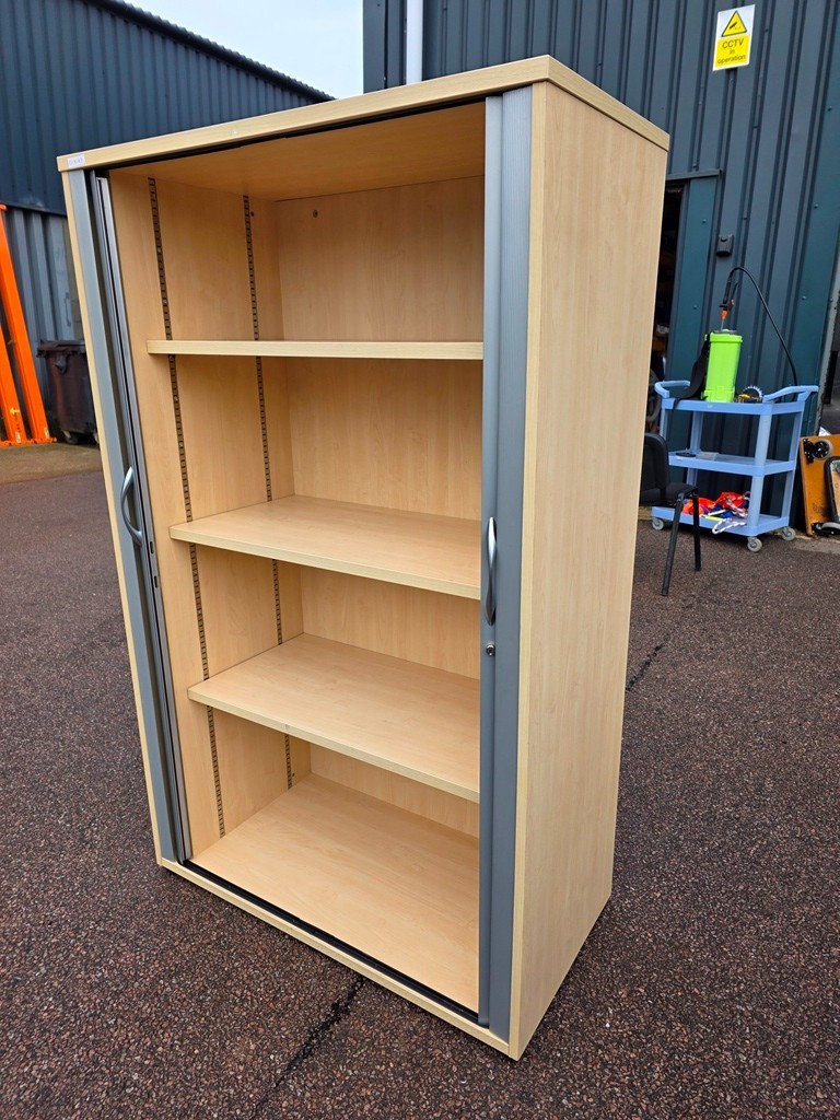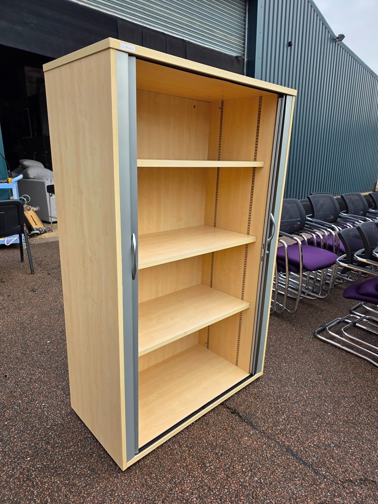 Commercial-grade storage cupboard in a light beech finish with grey sliding/tambour-style doors. Ideal for offices, schools, studios, and back-office storage where you want tidy shelving without outward-opening doors taking up space.
