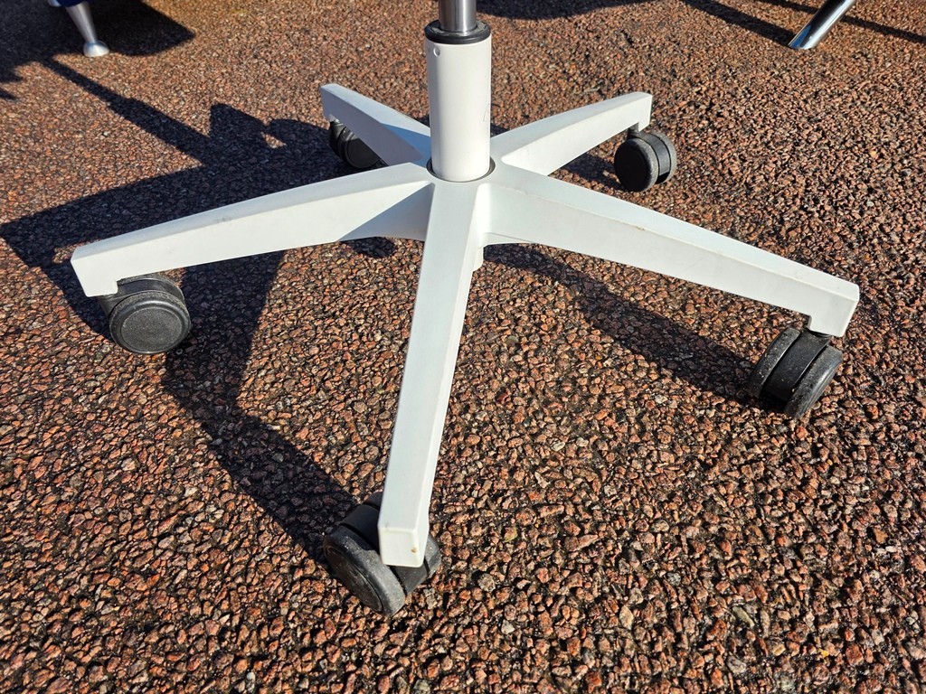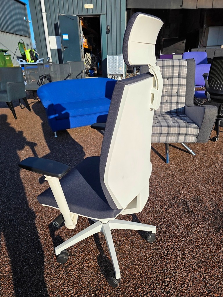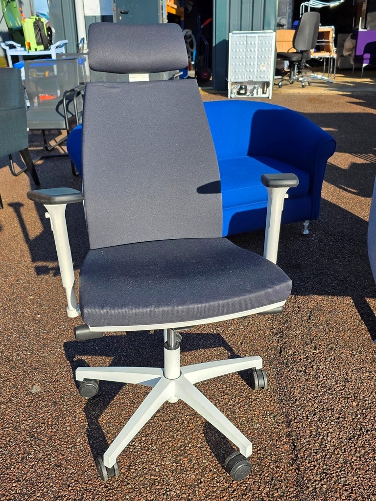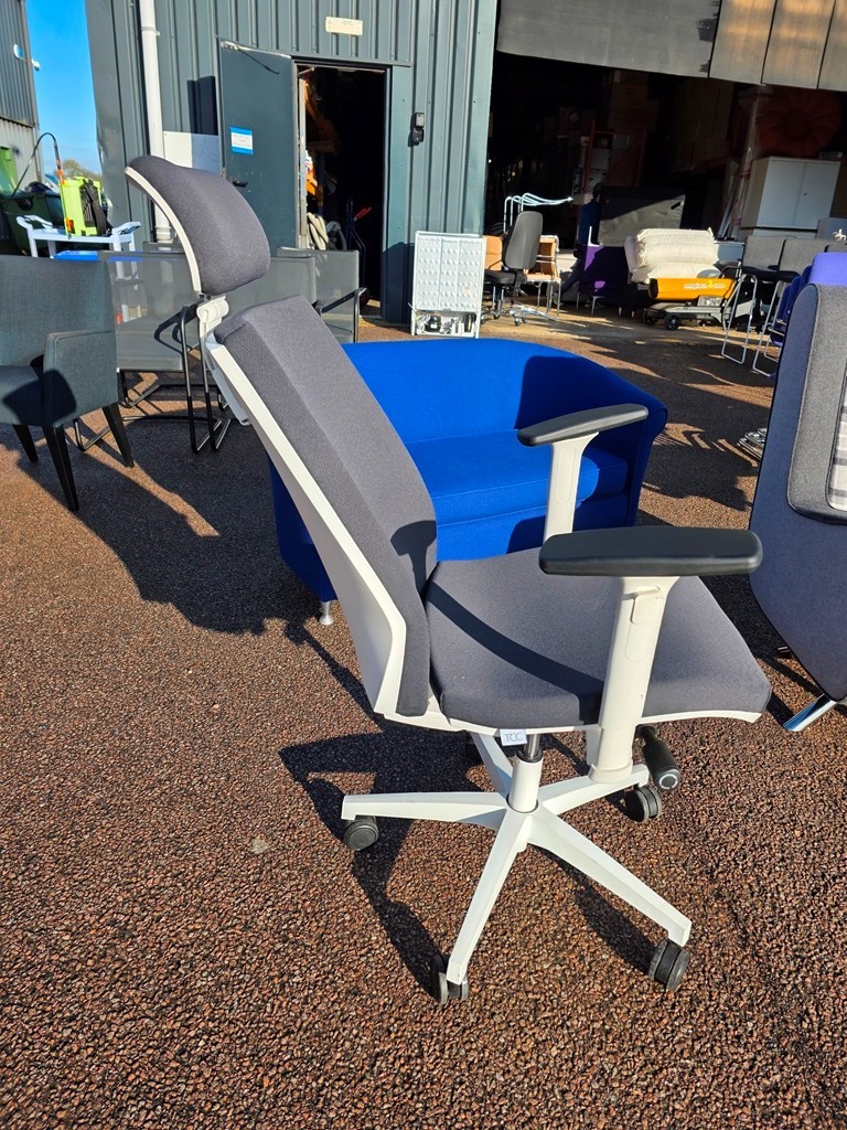 Modern ergonomic task chair in a smart grey fabric with a clean white frame and headrest. Ideal for home offices, studios, and workplaces where you want comfort and a professional look.