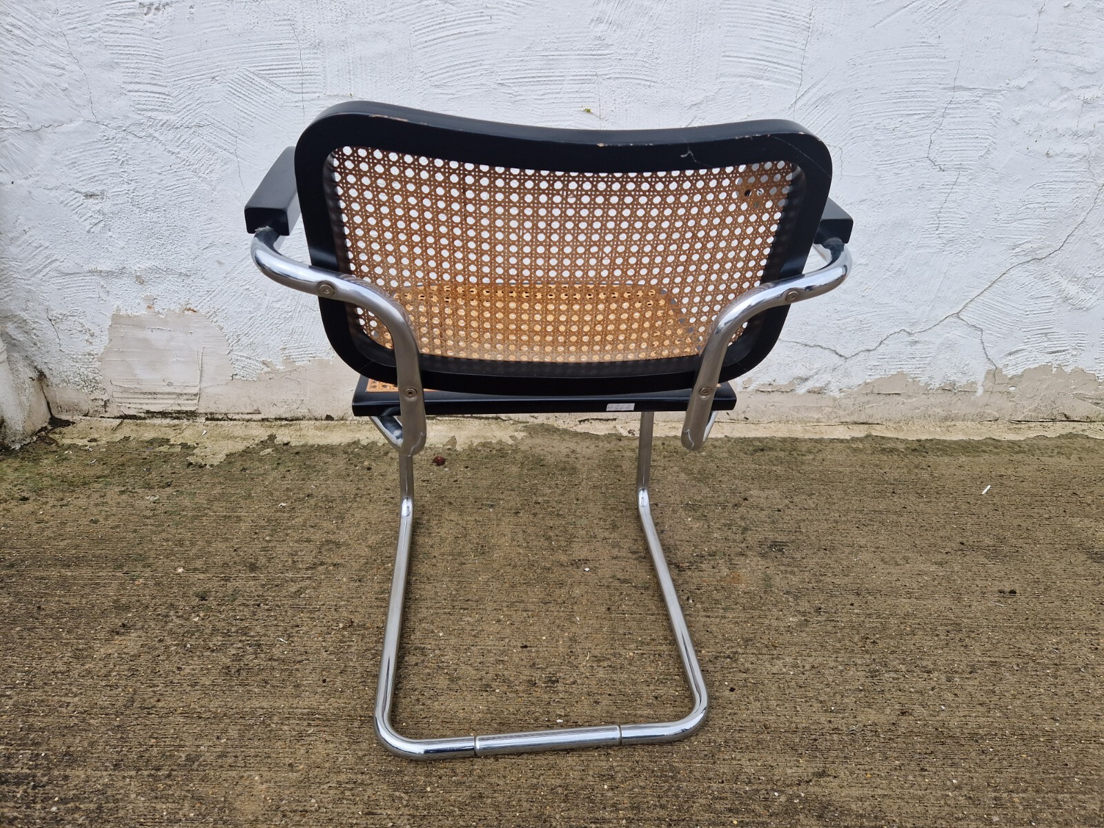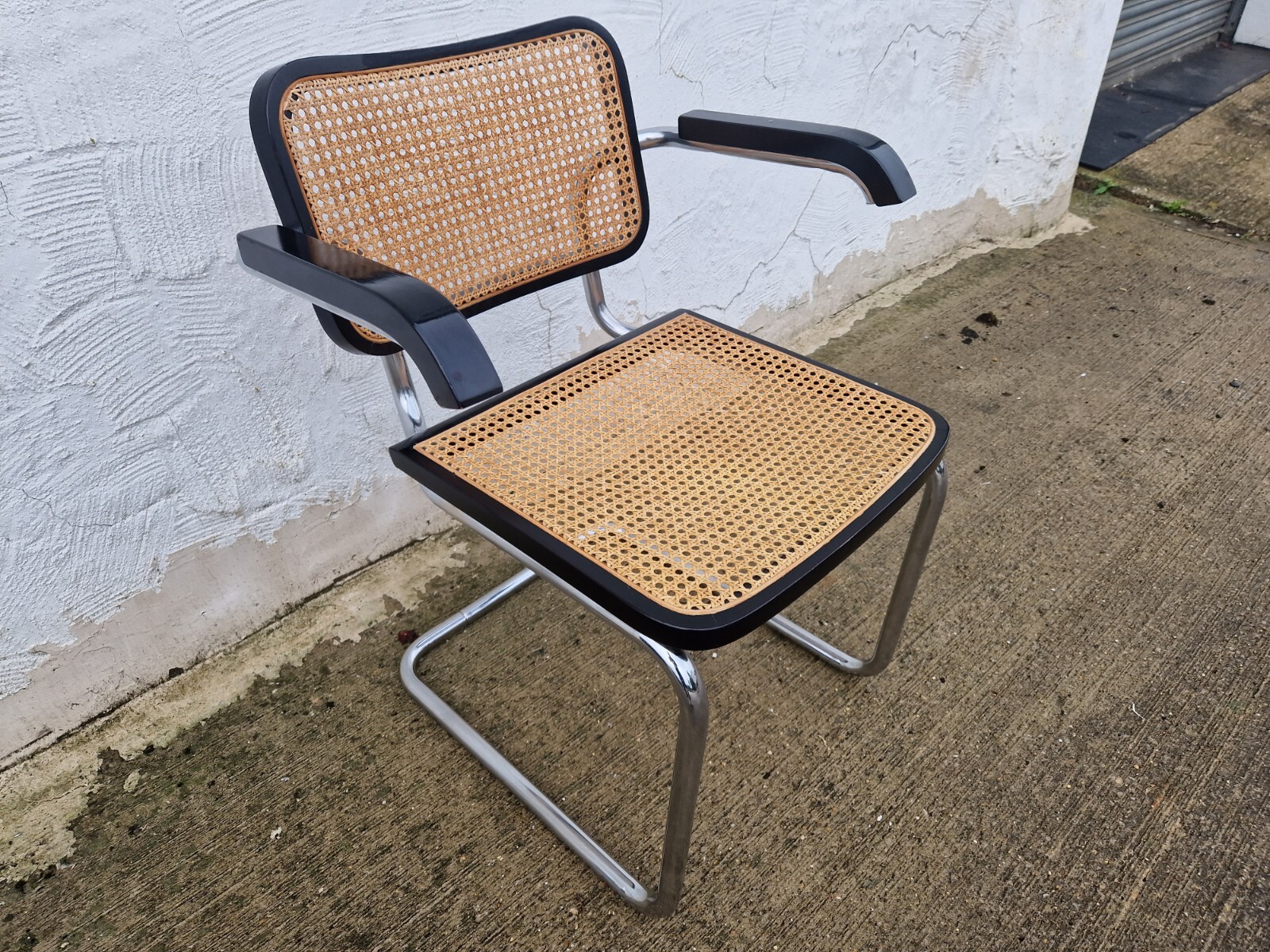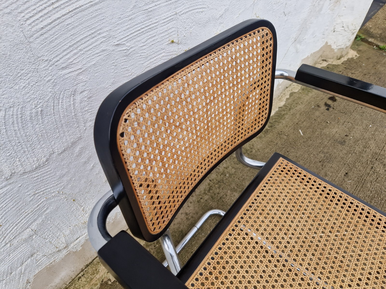 This iconic chair blends chrome-plated tubular steel with cane/rattan seat and backrest, framed in stained beech wood with sculpted armrests. A masterpiece of minimalism and functionality, ideal for: