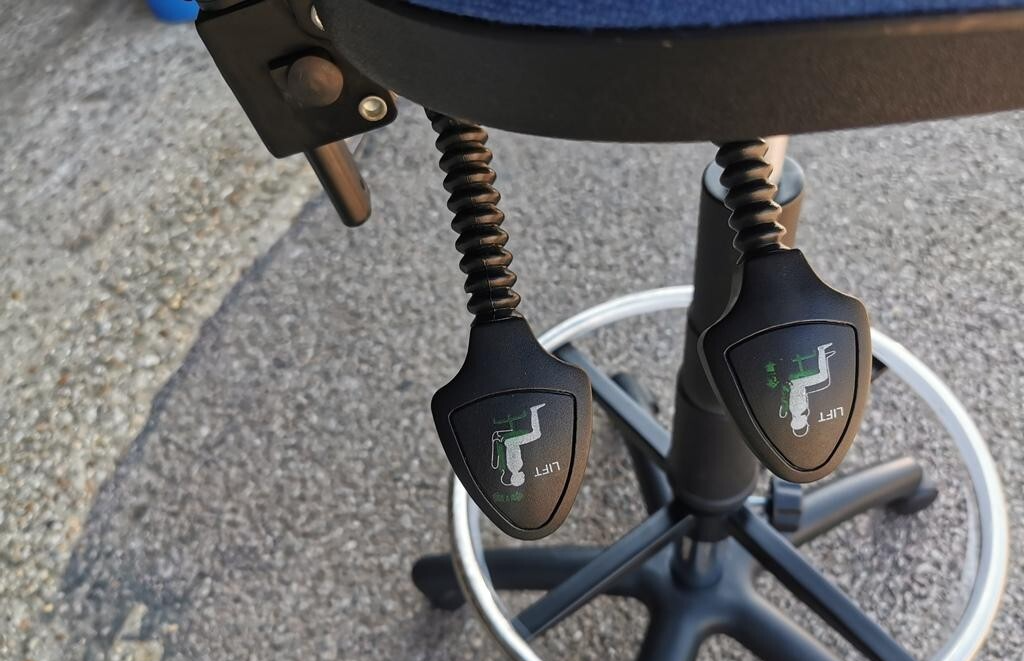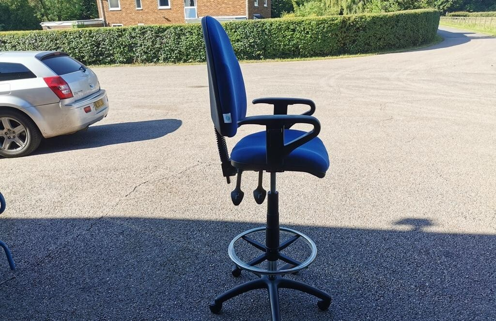 A professional draughtsman / drafting chair designed for higher desks, packing benches and workshop-style workstations. This chair has been deep cleaned, fitted with a brand new chrome gas lift and supplied with an adjustable 45cm foot ring for comfortable “off-floor” support.