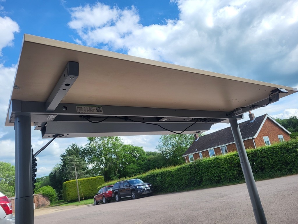 Desk is supplied part-dismantled for easier access: the metal frame remains fixed to the wooden desktop; only the legs and cable tray are removed.