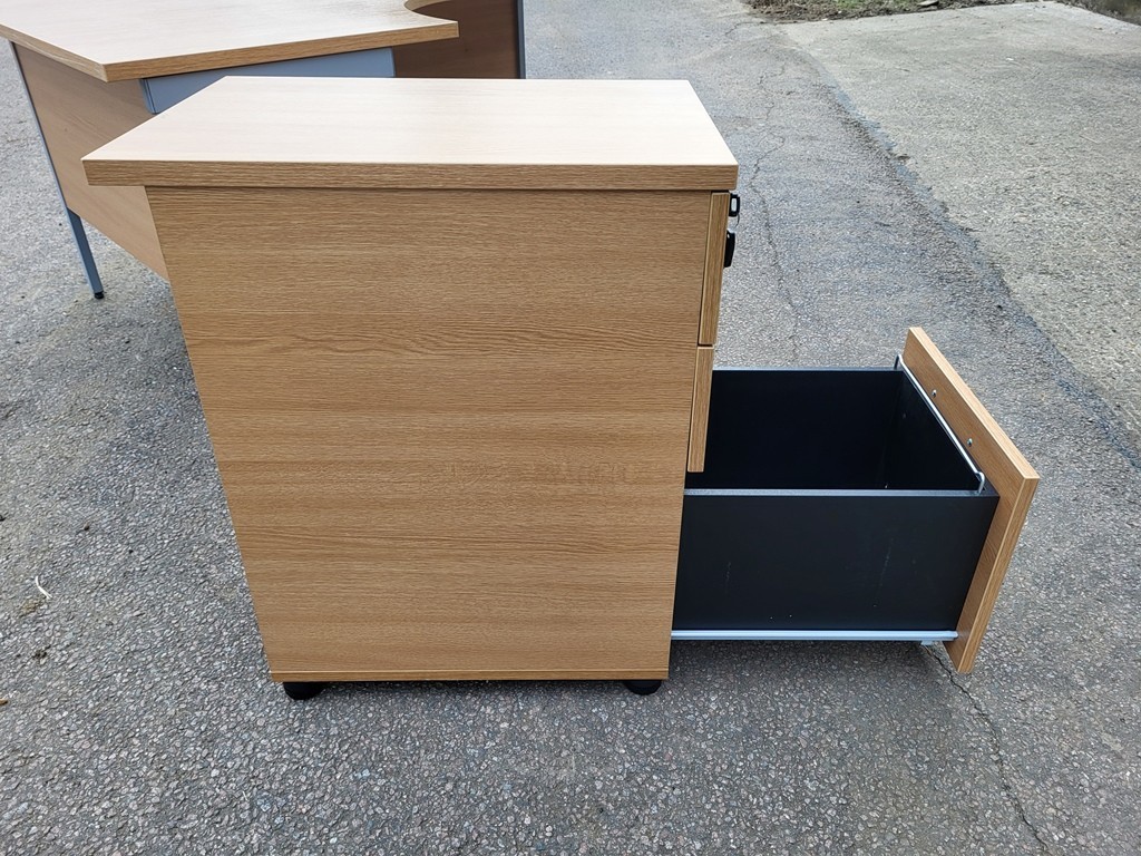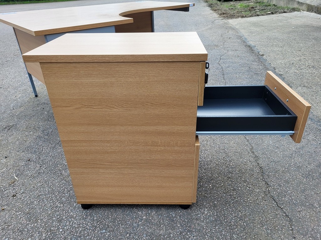 This beech wood effect left hand wave office desk with matching lockable mobile pedestal is perfect for professional workspaces, home offices, and study areas. Featuring a functional wave design, it offers extra workspace and improved ergonomics, with excellent cable management and storage.