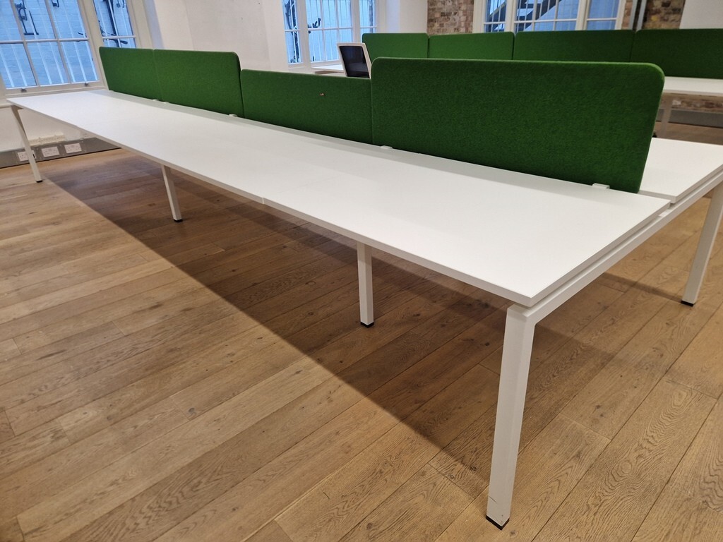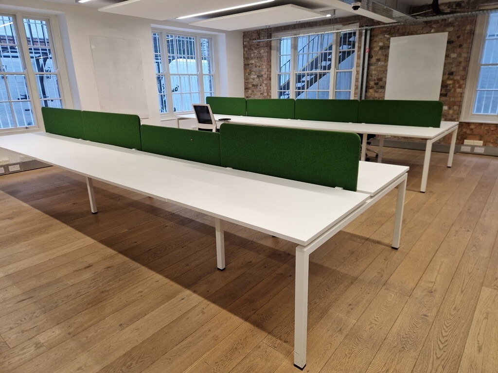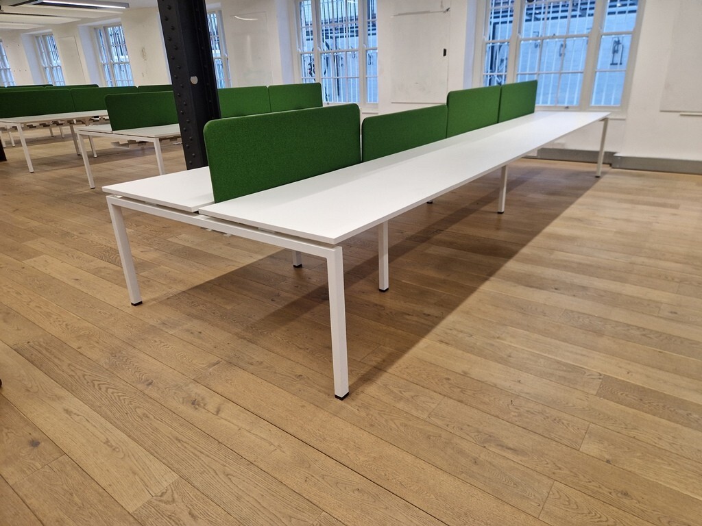 White 8‑Person Office Bench Desk with Green Privacy Screens & Cable Management – 520cm Wide