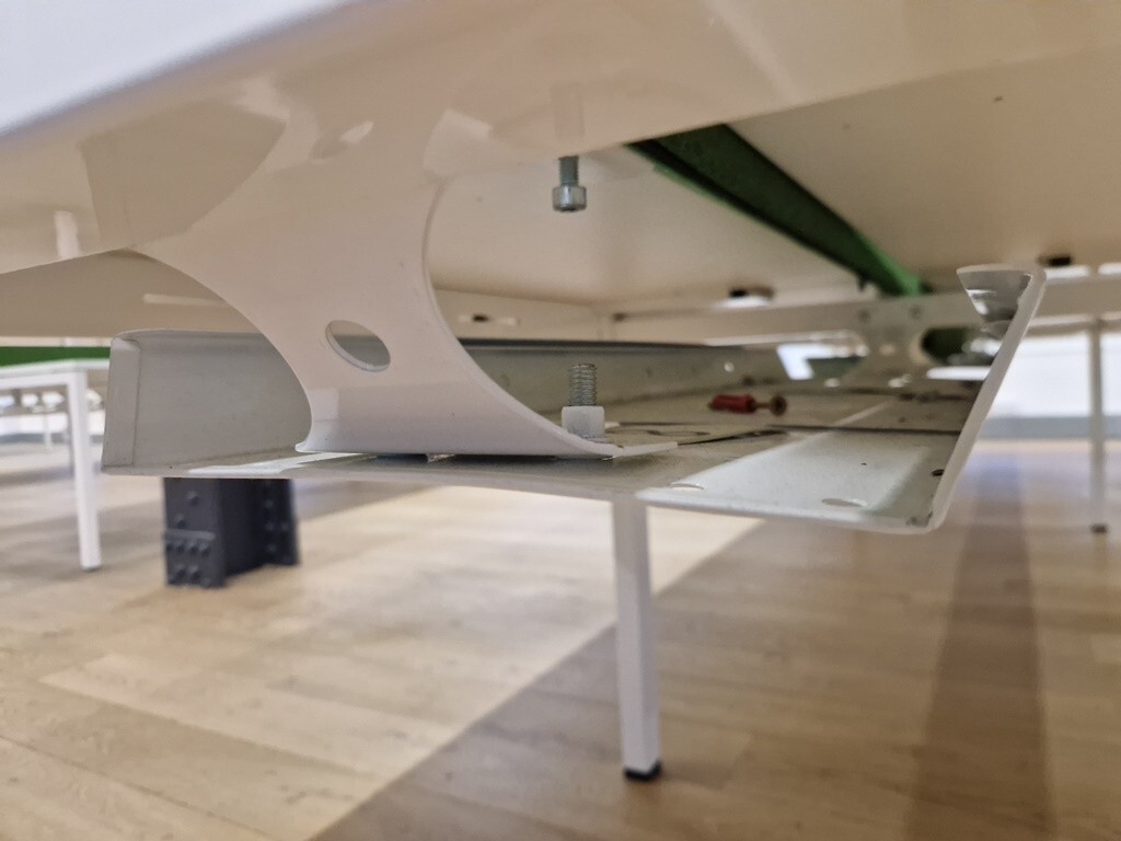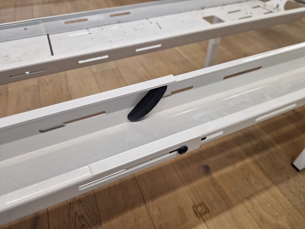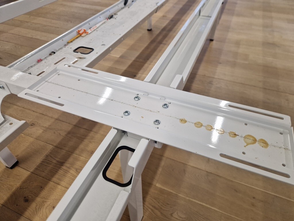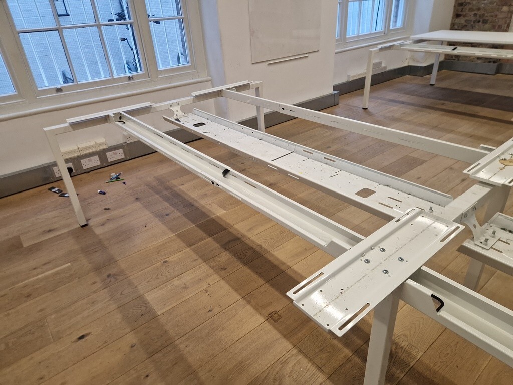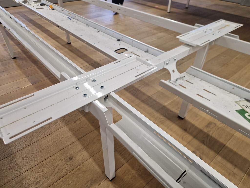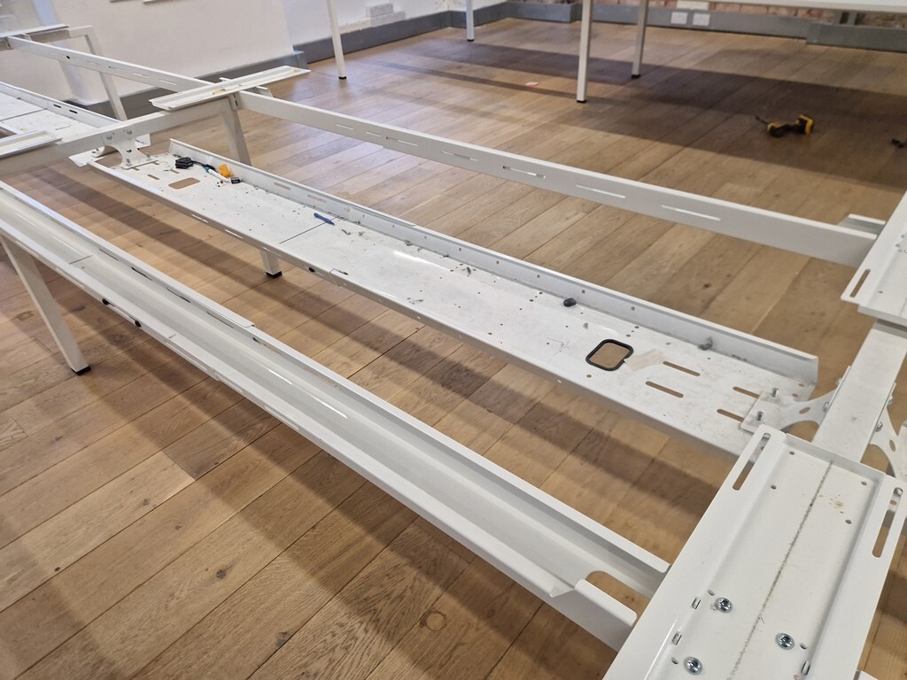 Steel cable trays under each workstation plus an extra‑large central tray to keep wires organised