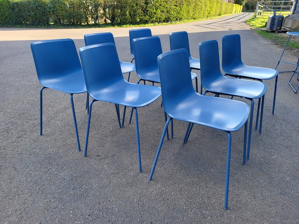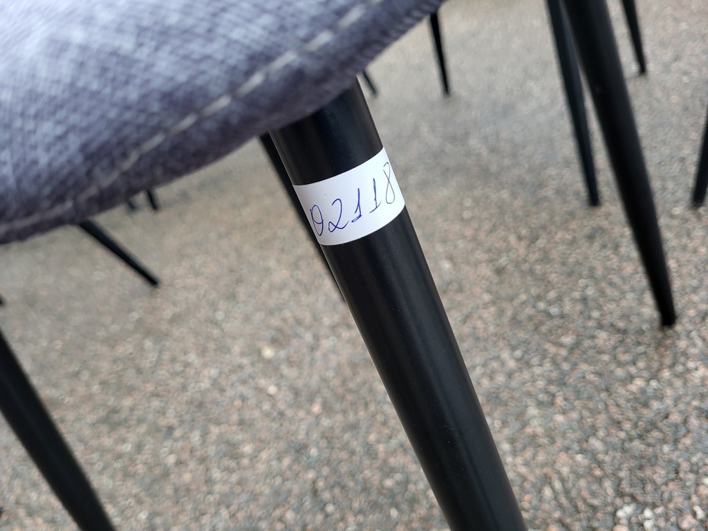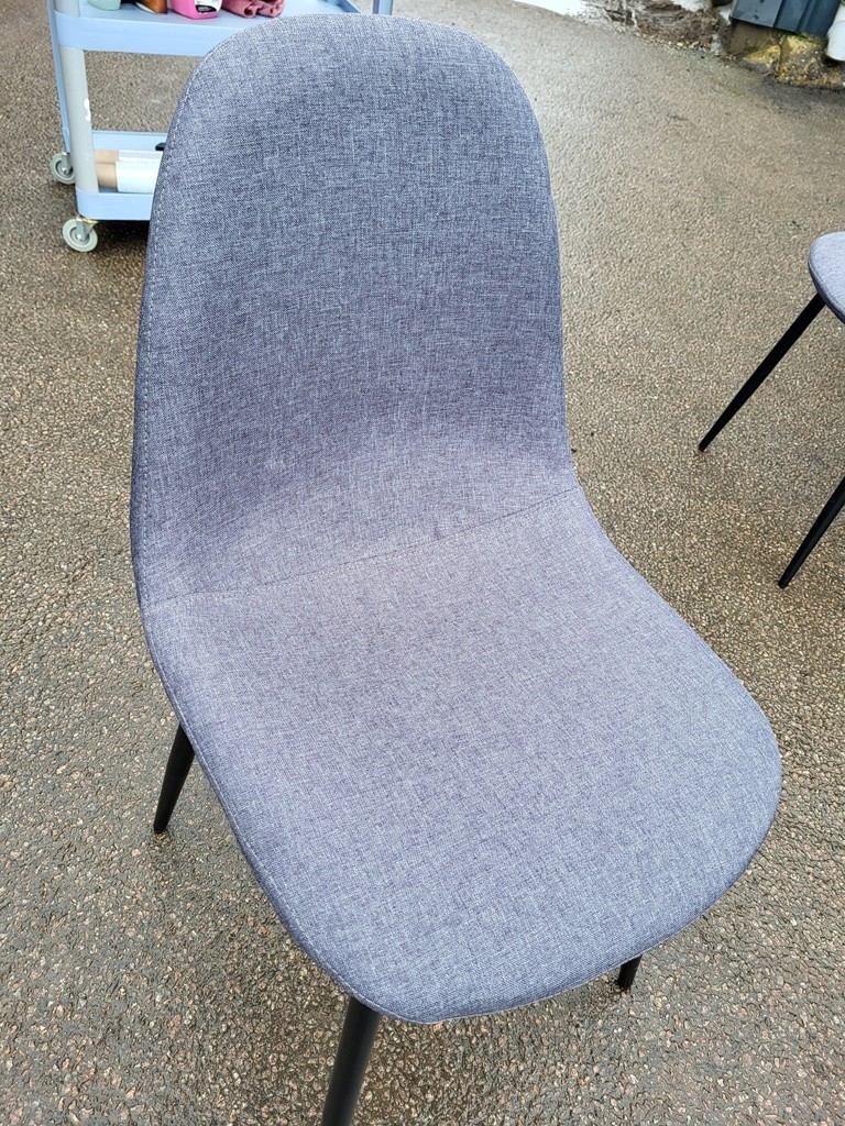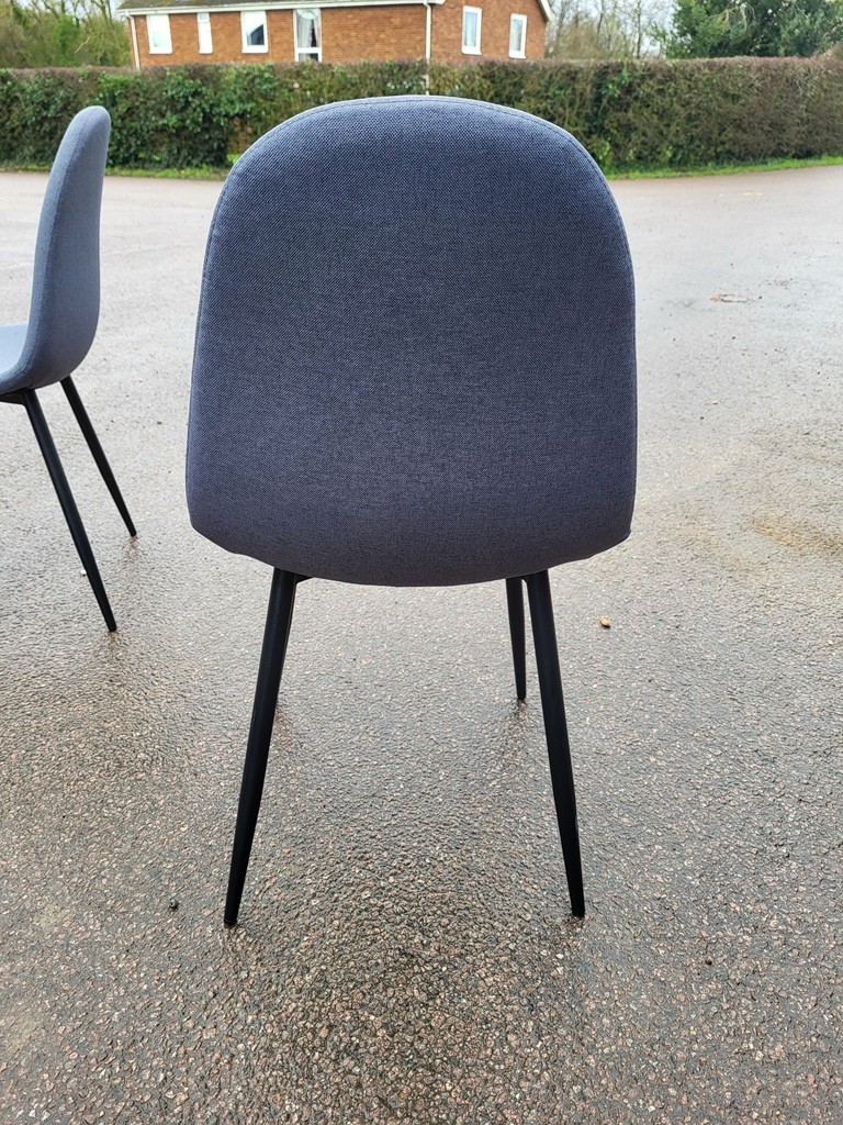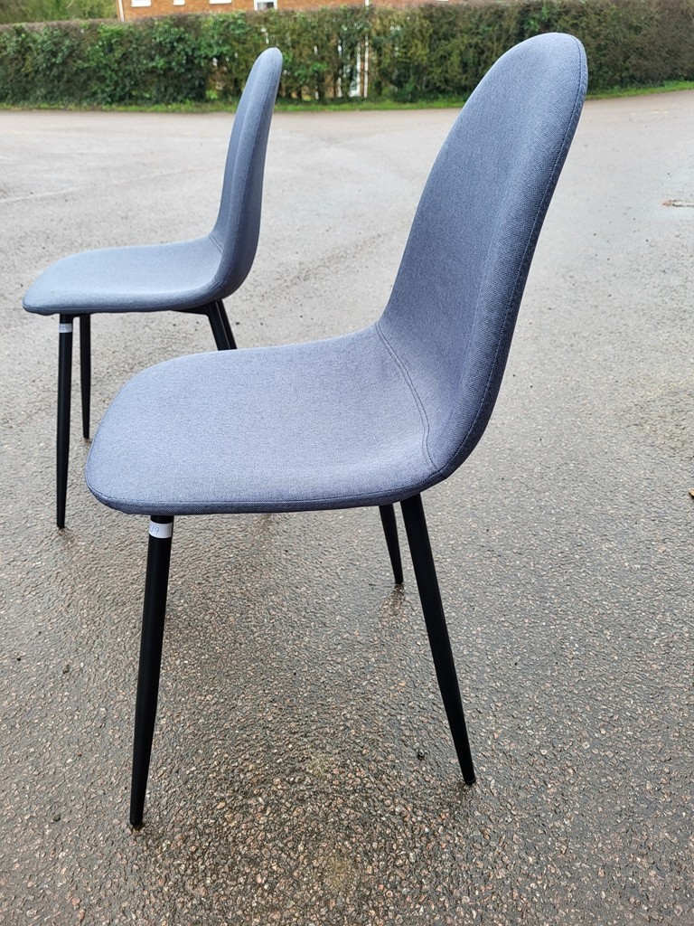 A minimalist, contemporary set of four upholstered chairs suitable for dining areas, meeting rooms, desks and general living spaces. The rounded seat profile with added cushioning provides comfortable support, while slim metal legs with plastic feet help protect floors.