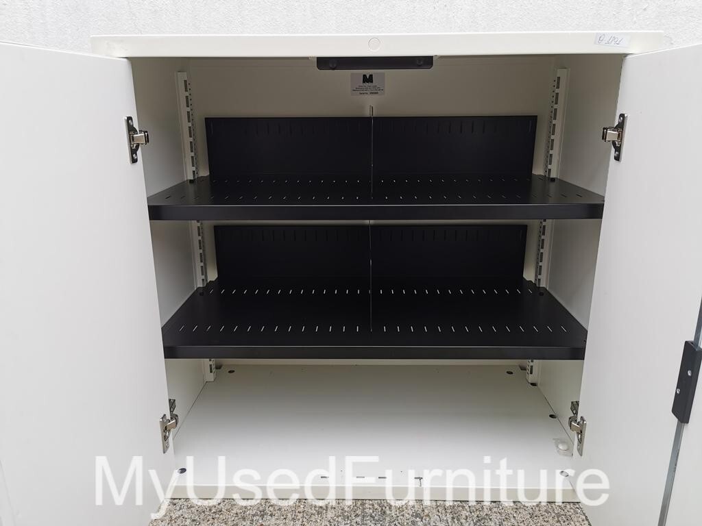 Desk-height metal office cabinet in a clean white finish with two adjustable steel shelves. Compact and robust—ideal for files, stationery and archive boxes in offices, schools and reception areas.