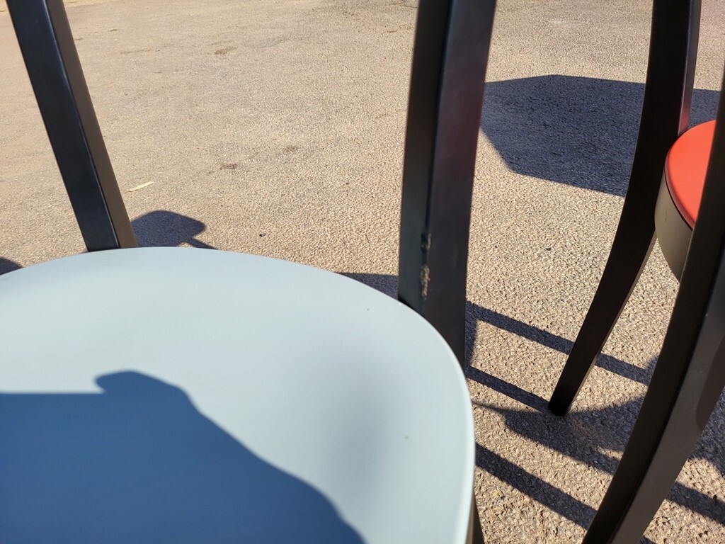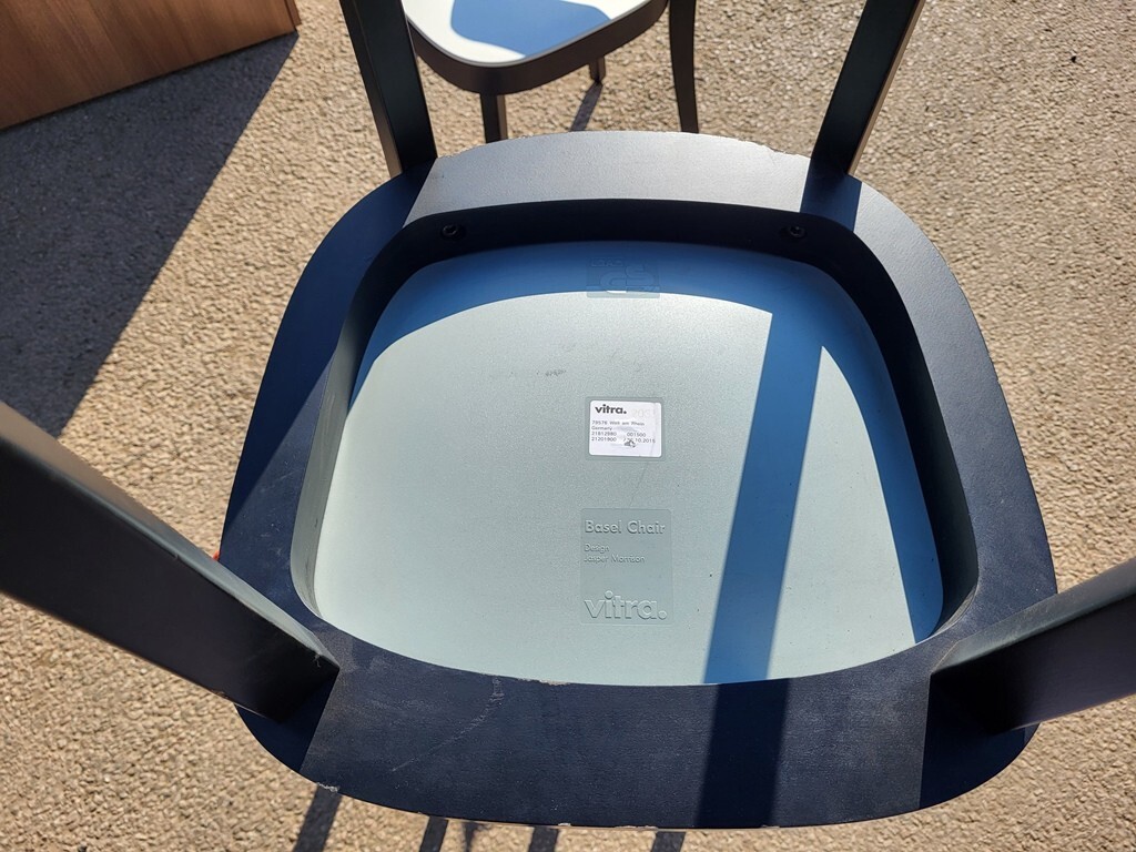 Model: Vitra Basel Chair, with a classic bistro-inspired frame that uses thin, organic ASA plastic seats and back panels attached to a natural or black-stained beech wood frame