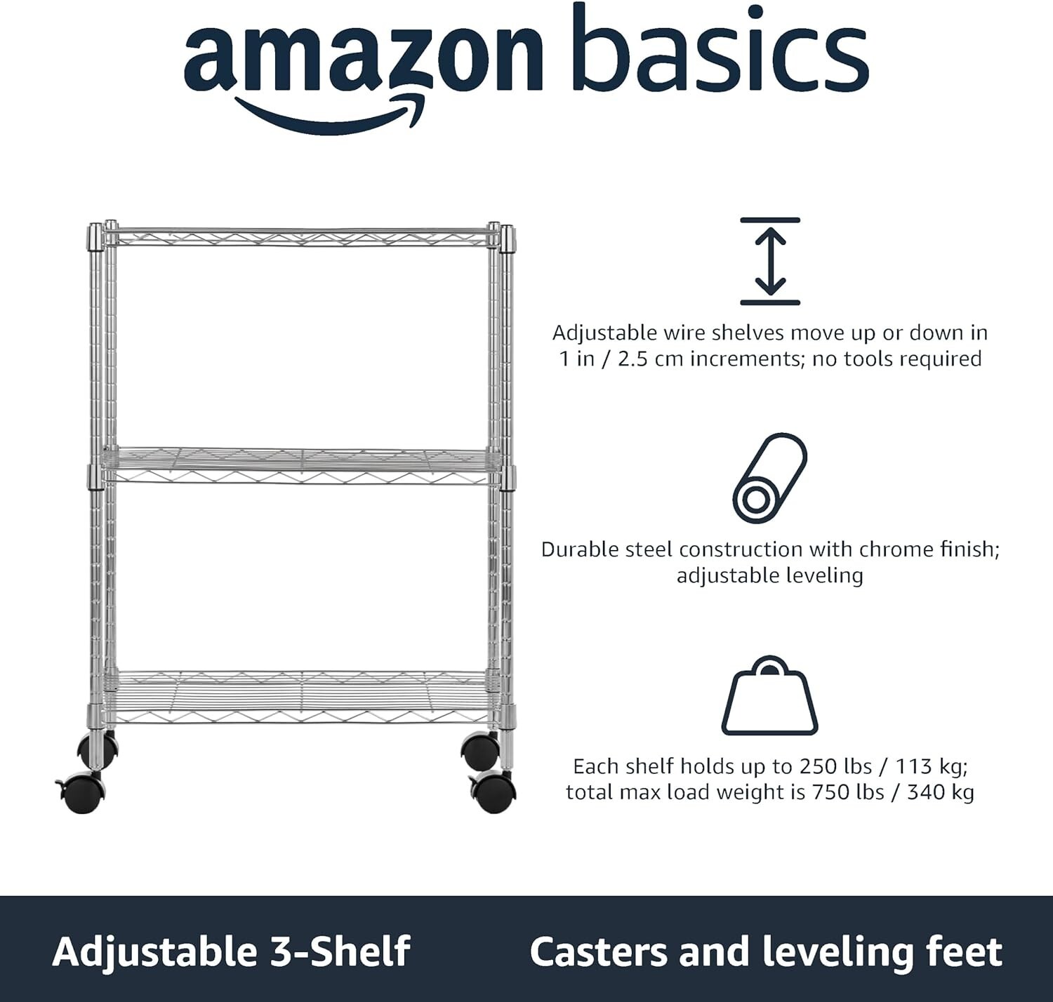 3-Shelf Narrow Storage Unit On Wheels With Height Adjustable Shelves and Levelling Feet, 340 kg Max Weight, Chrome, 34 cm D x 58.9 cm W x 83.2 cm H
