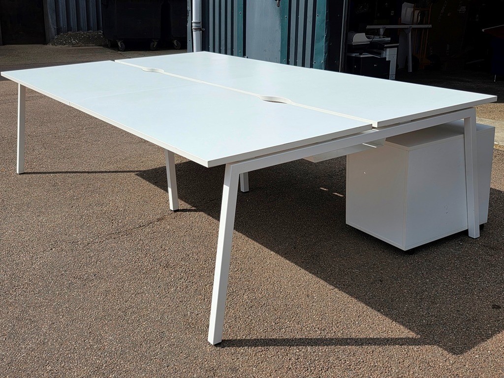 High-quality used 4-person bench desk designed for modern collaborative workspaces, offering a clean commercial look and a practical shared workstation layout.