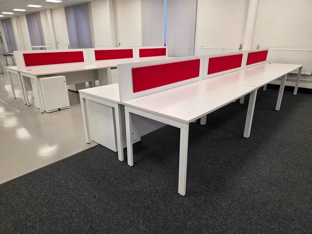 This white 6‑person office bench desk with privacy Red screens is ideal for large collaborative offices, co‑working spaces, or open‑plan layouts. Its contemporary design, advanced cable management, and sliding desktops make it a practical and professional solution for any modern workspace.
